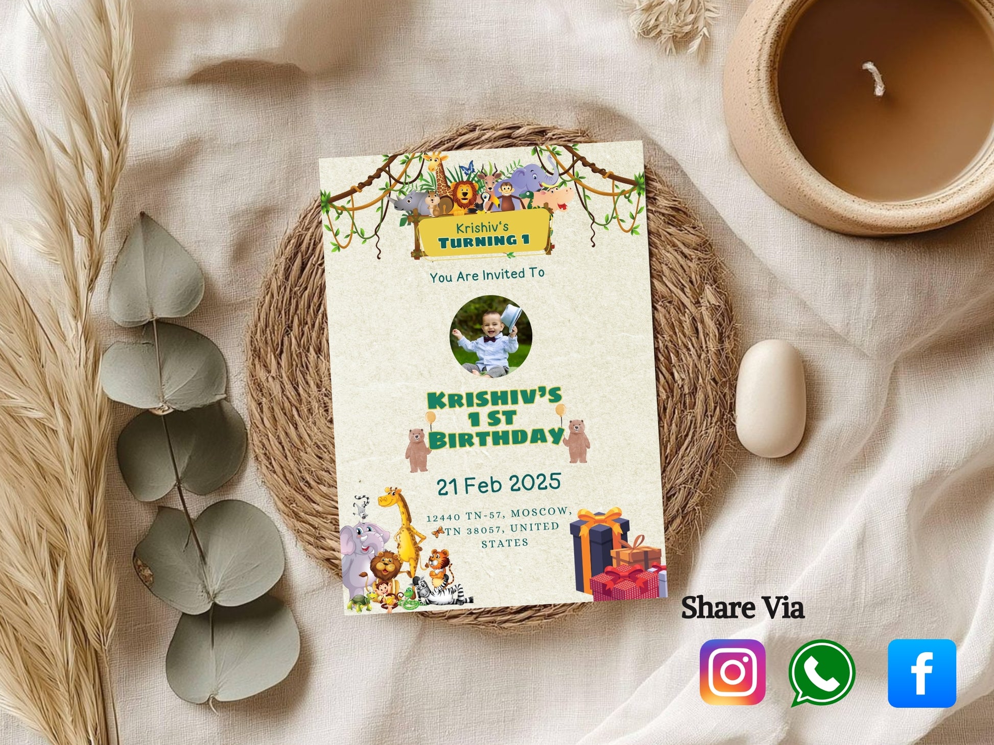Jungle Theme Birthday Invitation Card - Wild Safari Kids Birthday Party Invite