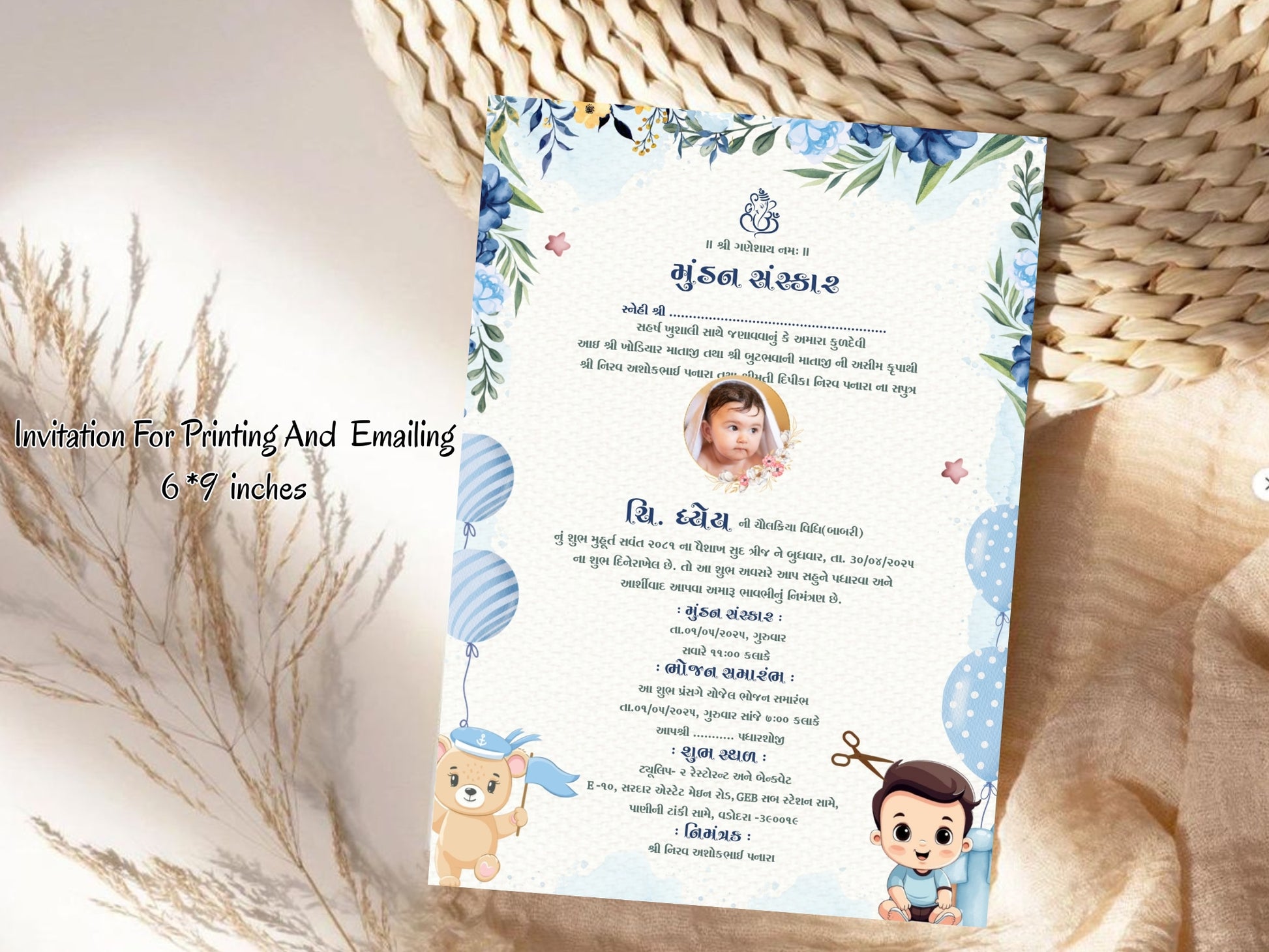 Fully customizable with your child’s name, ceremony date, time, venue, and family details, this invite is easy to share via WhatsApp, email, or social media. Make your Mundan Sanskar ceremony memorable with a stylish, editable, and ready-to-send digital invitation.