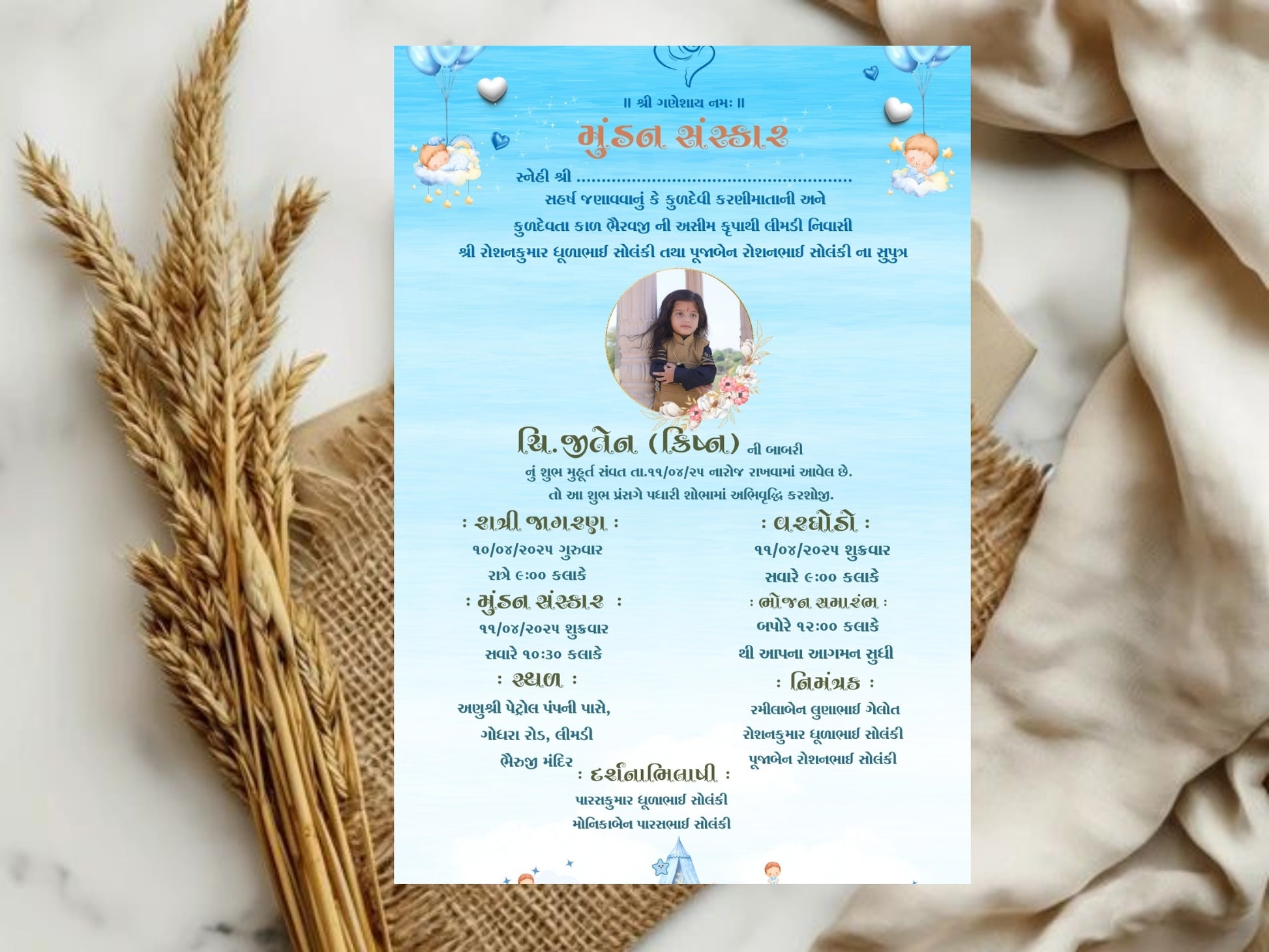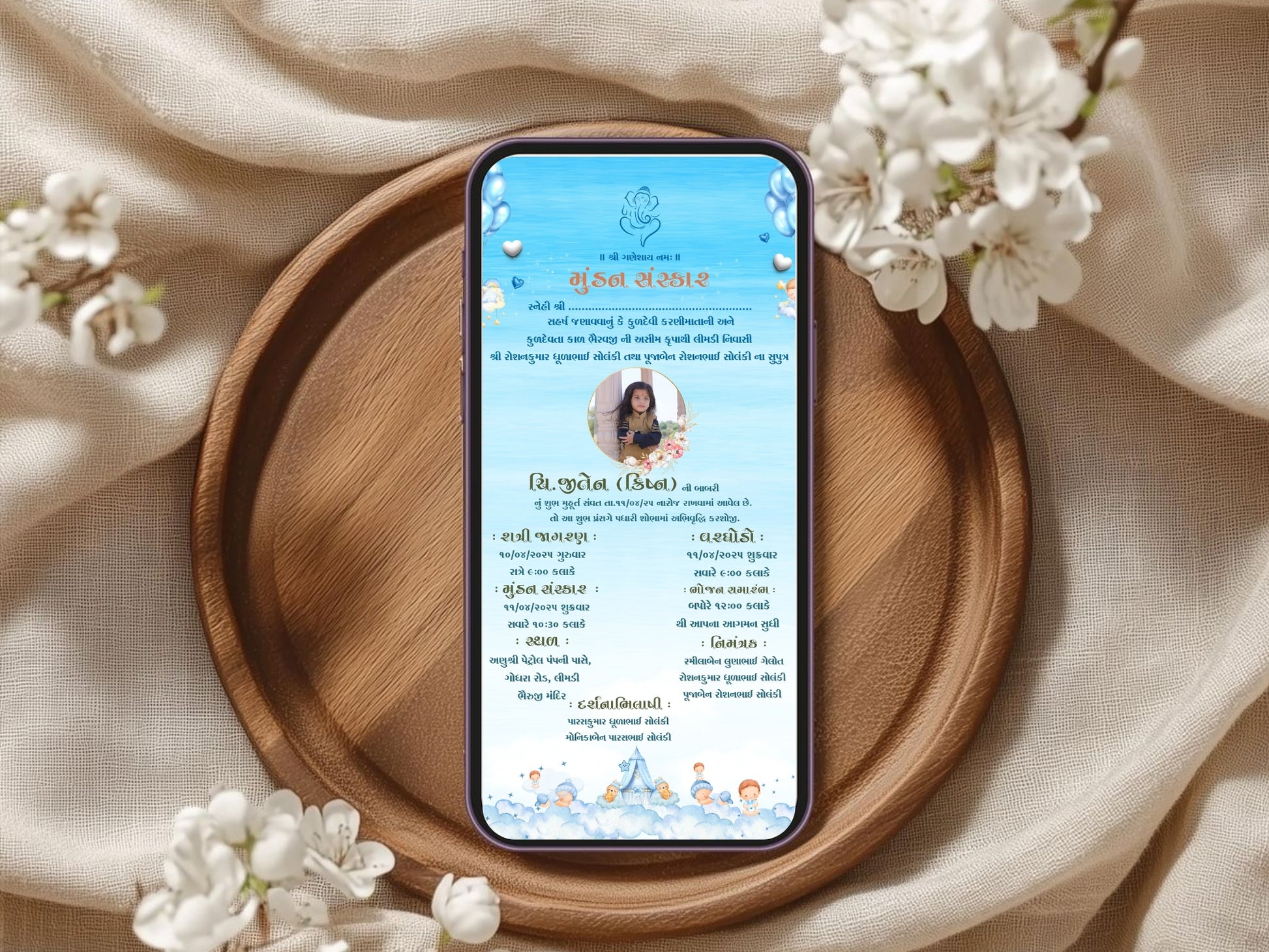 Fully customizable with your child’s name, ceremony date, time, venue, and family details, this invite is easy to share via WhatsApp, email, or social media. Make your Mundan Sanskar ceremony memorable with a stylish, editable, and ready-to-send digital invitation.