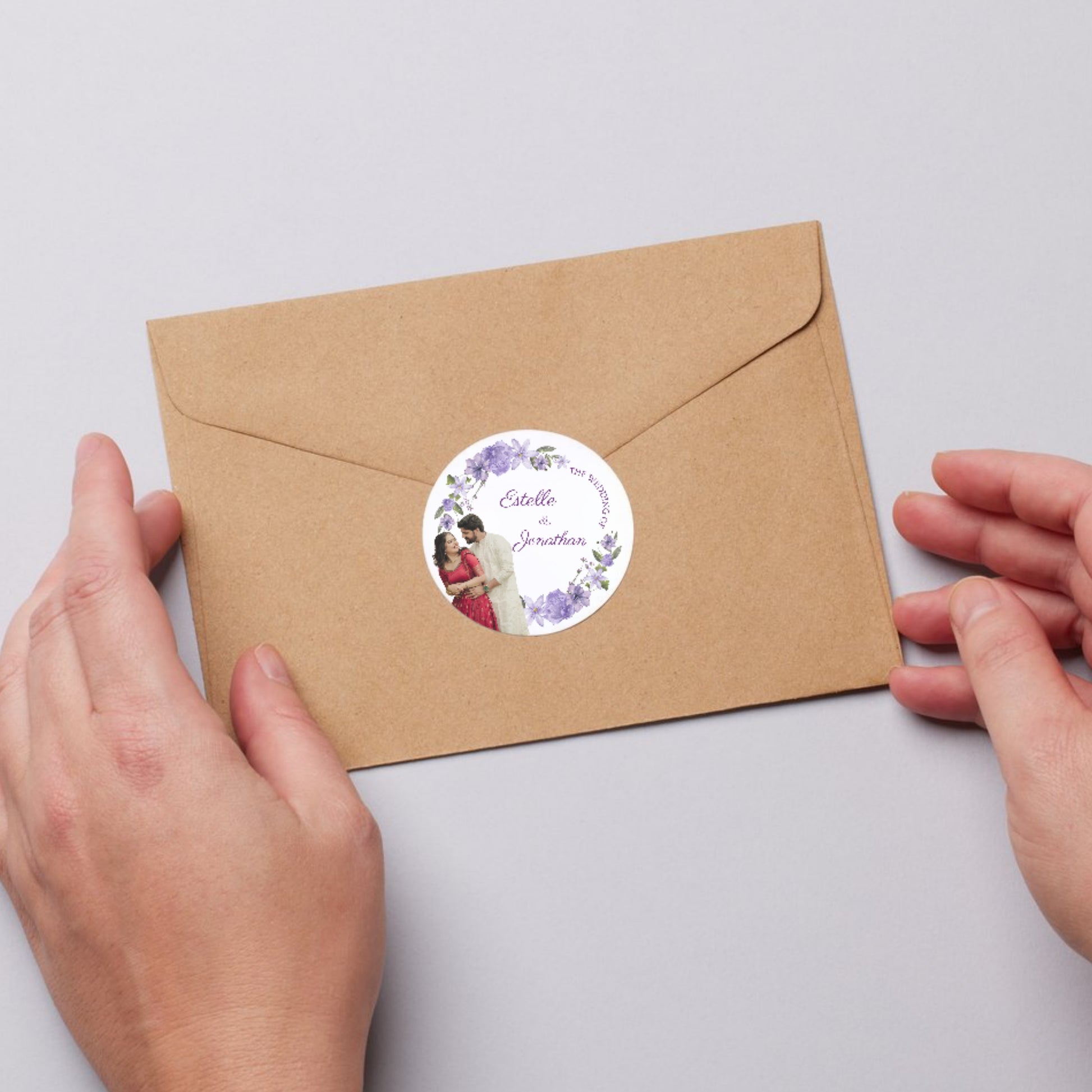 Purple Floral Wedding Thank You Stickers – Custom Name & Date Labels