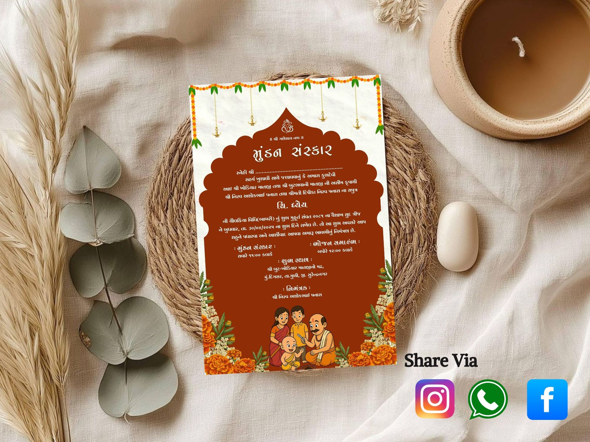 Fully customizable with your child’s name, ceremony date, time, venue, and family details, this invite is easy to share via WhatsApp, email, or social media. Make your Mundan Sanskar ceremony memorable with a stylish, editable, and ready-to-send digital invitation.